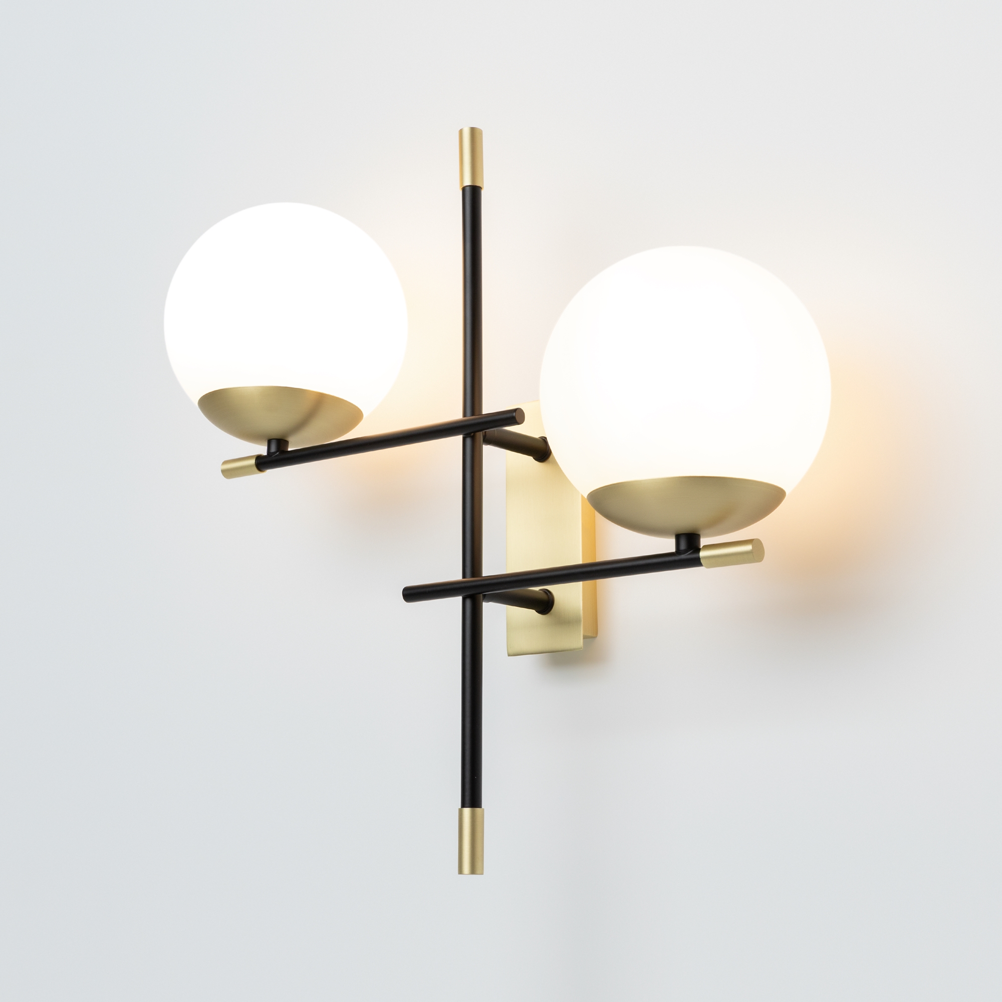 Арматура из металла в цвете матового золота. Плафоны-сферы из матового выдувного стекла. Модная асимметрия в дизайне. Источник света — лампы с цоколем Е14.