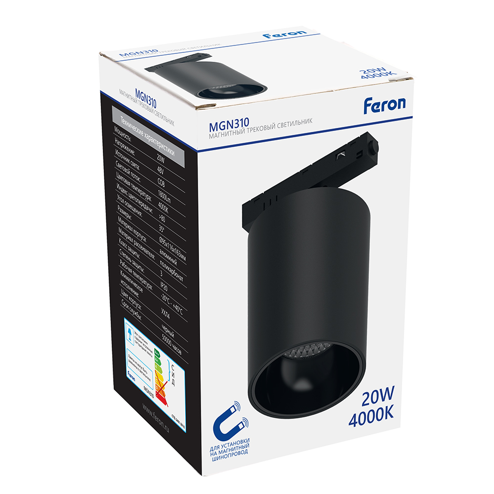 Светильник трековый на шинопровод, - (ДПО) FERON MGN310, 20W, 4000К (белый), 48V, 1800Lm, цвет черный, корпус алюминий, рассеиватель поликарбонат, 116*95*163 мм